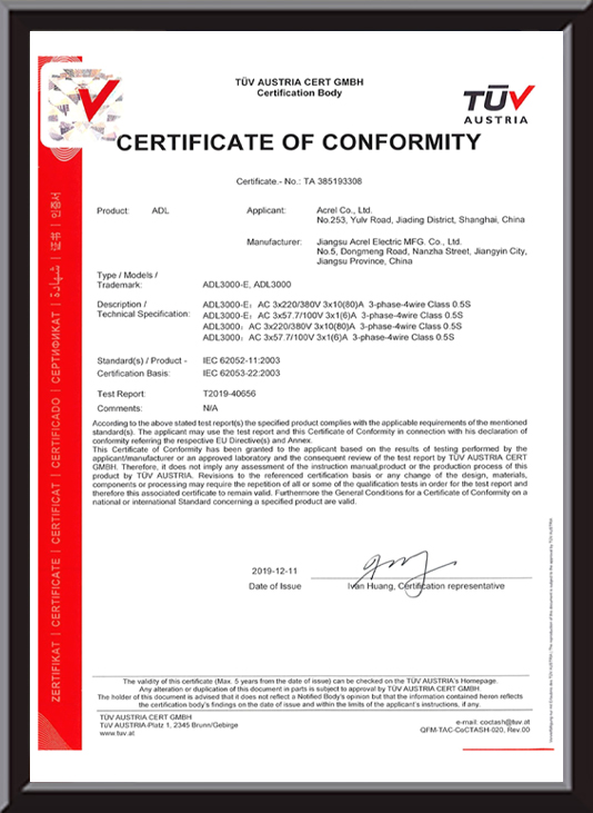 ได้รับการรับรองโดย UL ตรงตามมาตรฐานความปลอดภัยและประสิทธิภาพที่เข้มงวด ด้วยกระแสไฟพิกัด 3×277/480V จึงเหมาะสำหรับการใช้งานที่หลากหลาย การวัดที่มีความแม่นยำสูง ขนาดที่เล็ก และการติดตั้งที่เรียบง่ายทำให้เป็นตัวเลือกที่เหมาะสำหรับการตรวจสอบและการจัดการพลังงานในสภาพแวดล้อมทางอุตสาหกรรมและเชิงพาณิชย์ที่หลากหลาย