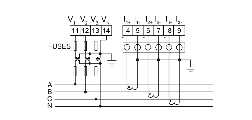 | อินพุต | การเชื่อมต่อ | เฟสเดียว 2 สาย 3 เฟส 3 สาย 3 เฟส 4 สาย | ||